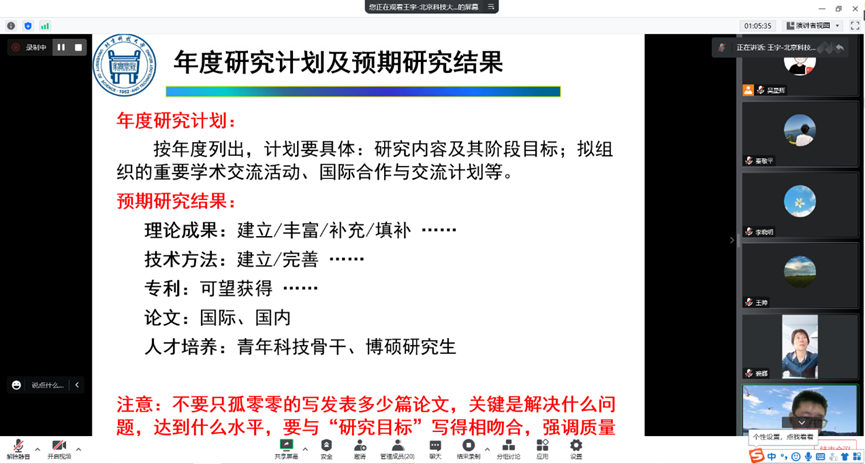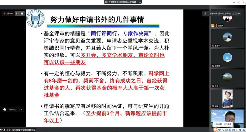 2022年11月17日下午,伟德国际victor·1946源自召开了国家自然科学基金线上辅导会。此次辅导会特邀北京科技大学王宇教授进行基金申报辅导。会议由副院长裘娜主持,全体教师参会并听取专家意见。