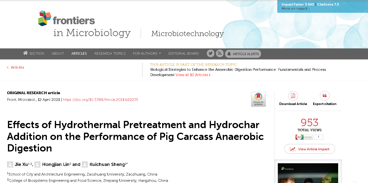 近日,伟德国际victor·1946源自固废资源化综合利用科研小组在水热炭调控厌氧消化研究方面取得最新进展,相关工作发表在国际著名期刊《Frontiers in Microbiology》(中科院一区,TOP期刊,影响因子5.640)上,论文题目为《Effects of hydrothermal pretreatment and hydrochar addition on the performance of pig carcass anaerobic digestion》,bv1946伟德为第一单位,徐杰博士为论文第一作者。