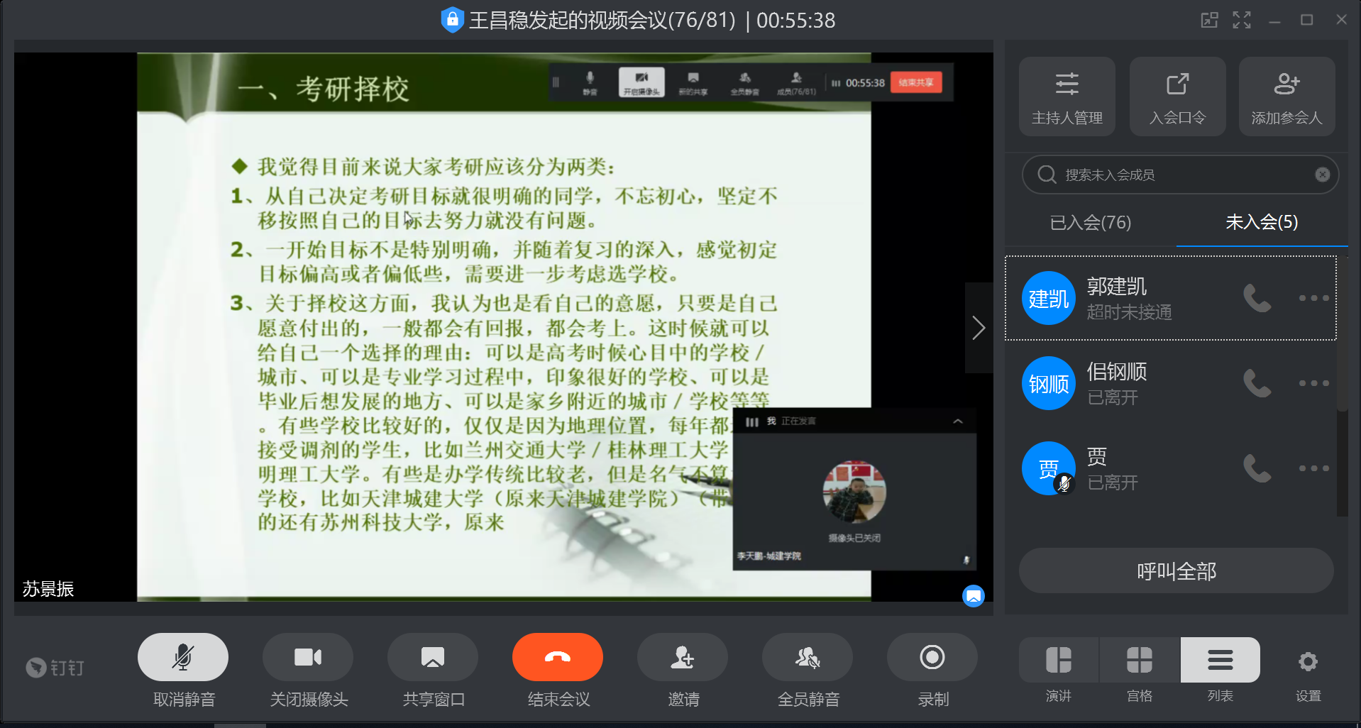 2020年6月17日上午9:00-10:30,我院给排水科学与工程专业采用钉钉视频会议的形式组织召开了2017级考研动员会(既经验交流会)。给排水科学与工程专业全体教师、2017级全体同学及2018、2019级部分同学参加此次视频会议。