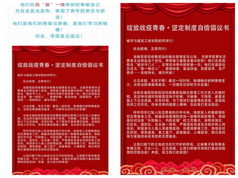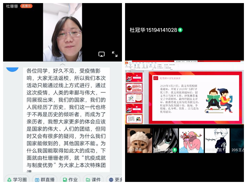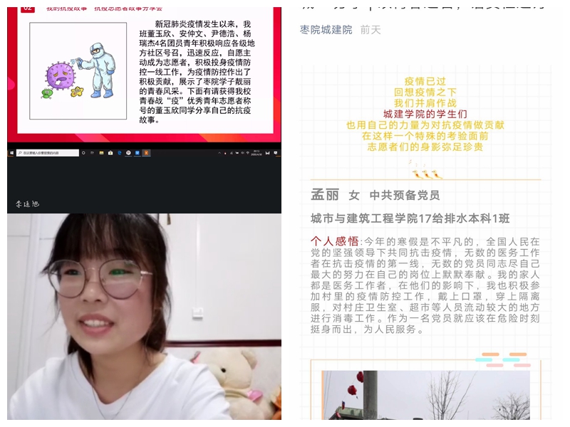 为确保全面准确做到“五个讲清楚”,保证思想引领作用落到实处,引导青年学生进一步坚定制度自信,团总支副书记杜珊珊利用钉钉为我院学生会干部、各班团支部书记围绕抗疫成就与制度优势开展网上团课;在认真完成青年大学习集中学习的基础上,又结合我院工作实际与专业倾向,各团支部书记组织召开网上主题团日活动;各团支部在五四评优中获得“优秀团干”称号、被评为青春战“疫”优秀青年志愿者的同学也通过钉钉或QQ群开展宣讲报告、故事分享等学习宣传活动,向大家分享自己的心得;利用“枣院城建院”微信公众平台,开展网络知识竞赛,以此夯实同学们思想基础建设,提升理论学习的思想性、亲和力和渗透度;向全体同学发出倡议“呼吁同学们加入到志愿者的行列中来,持续深入开展疫情防控志愿服务工作”,在做好自身安全防护的前提下,依法科学有序参与疫情联防联控,为坚决遏制疫情扩散、夺取防控斗争胜利贡献青春力量;结合疫情防控实际推荐优秀抗疫志愿者作为入党积极分子候选人。