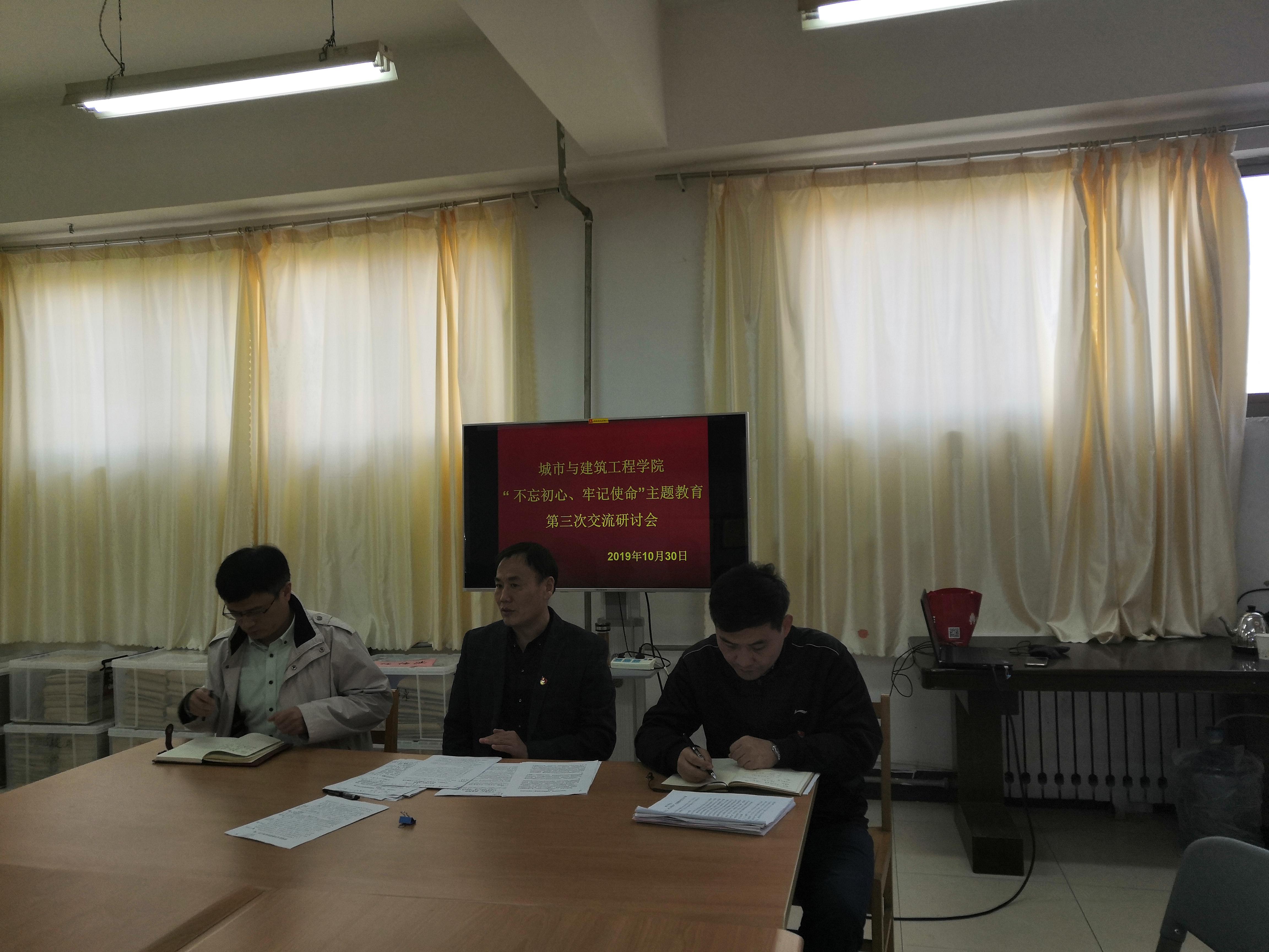 按照我校“不忘初心、牢记使命”主题教育工作计划和安排,10月30日下午,城市与建筑工程学院在理2321资料室进行第三次专题交流研讨。研讨会由党总支书记李振清主持,处级班子成员及各党支部书记参加会议。