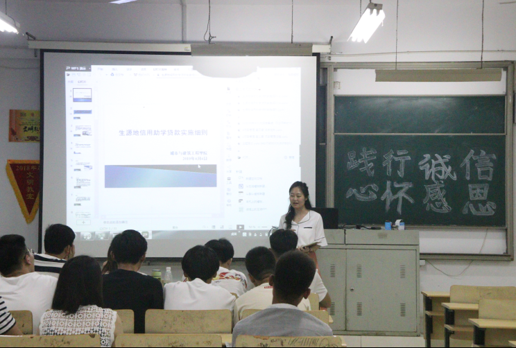会上,城建学院资助大使宋宾讲解了信用地贷款主要内容、贷款期限与利率、生源信用地贷款政策、征信信息、还贷流程及还款方式等方面,并用事例说明了诚信还款的重要性。其次,张璇老师向同学们讲解了诚信还款部分,着重对助学贷款的意义、作用,以及诚信对于大学生的重要性做强调说明。最后,张璇老师对全体2019届贷款毕业生提出了诚实守信,如期还贷的期望。希望大家都能按时还款还息,珍惜自己的信用记录,避免因为违约给自己今后的生活和工作带来不便。