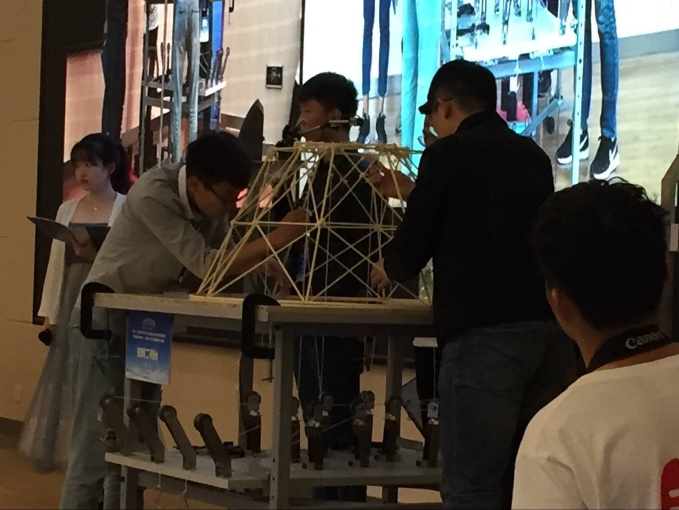 本次大赛,有来自山东大学、哈尔滨工业大学(威海分校)、中国石油大学、青岛理工大学等28所省内高校的31只队伍参加。我院由赵澄、张耀、贾传奇三名同学组成的队伍在袁下下、李晓明老师指导下参加了比赛。竞赛以“承受多荷载工况的大跨度空间结构建模设计与制作”为赛题,模型采用竹质材料制作,并在加载现场施加一级、二级竖向荷载和三级水平荷载来考验结构模型的挠度和承载能力。评委对各参赛队在设计计算、结构选型与制作质量、现场表现、模型承载力、模型刚度五个环节中的表现分别评分,最后由组委会来综合评定各队总得分。我院作品“简约”成功通过了一级竖向荷载40KG、二级最大竖向荷载24KG和三级最大水平荷载8KG后完好无损。据统计,其中31个比赛作品中有1/3的作品在没达到要求承载荷载前模型已破坏。