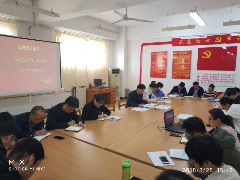 为了进一步学习贯彻习近平新时代中国特色社会主义思想、党的十九大、十九届三中全会和两会精神,落实依法治国方针,加强教师、党员师生法制观念,依法治学,依《bv1946伟德章程》办学,城建学院在3月28日下午,利用“双周三主题党日”组织开展学习《中华人民共和国宪法修正案》。党总支书记李振清主持会议。