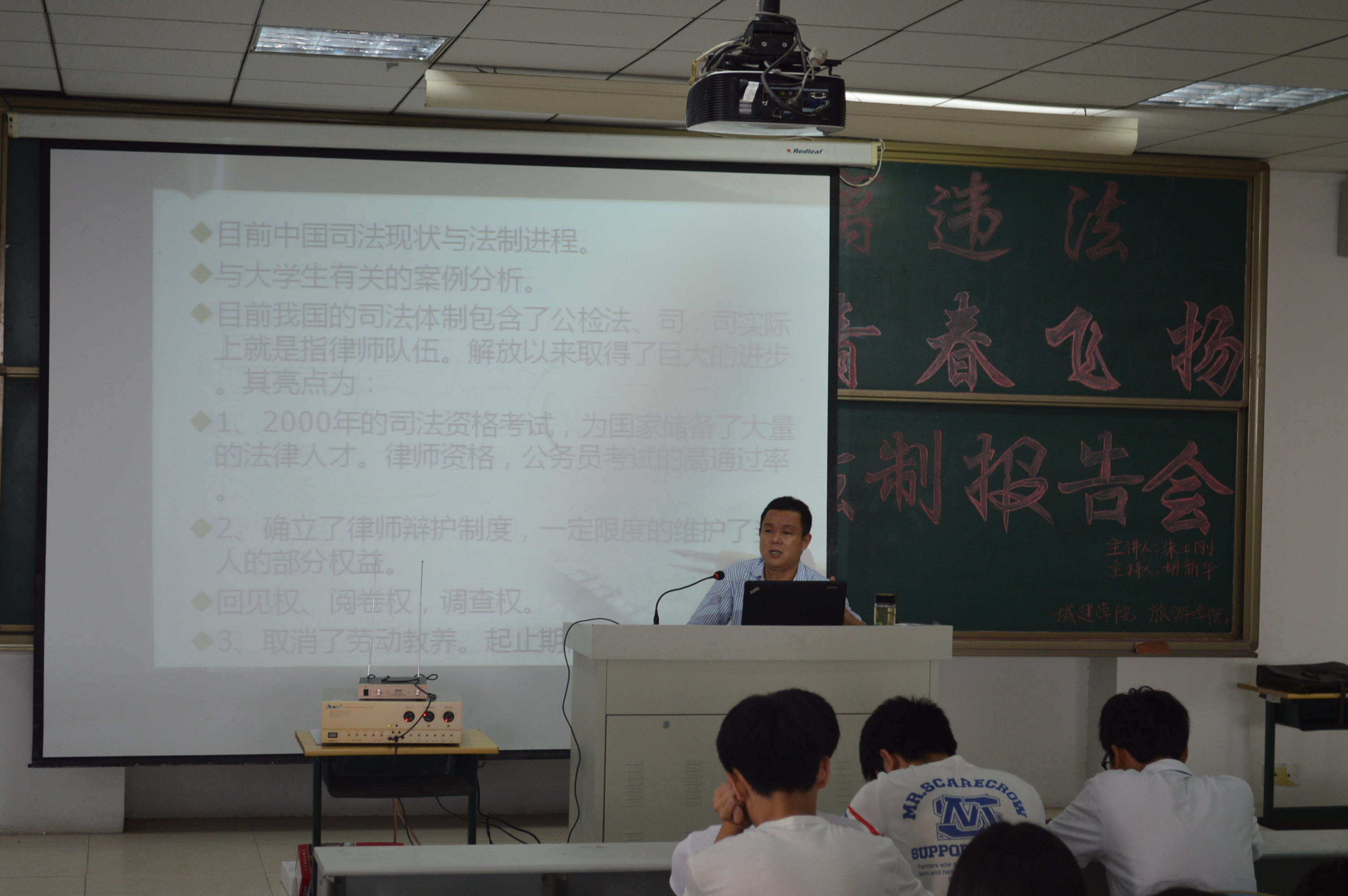 为增强学生的法制意识与安全知识,进一步促进学生遵纪守法的自觉性和主动性,6月19日下午,山东龙头律师事务所主任朱士刚为城建学院和旅游学院200多名学生作了一场题为《大学生违法犯罪案例分析》法制报告会。