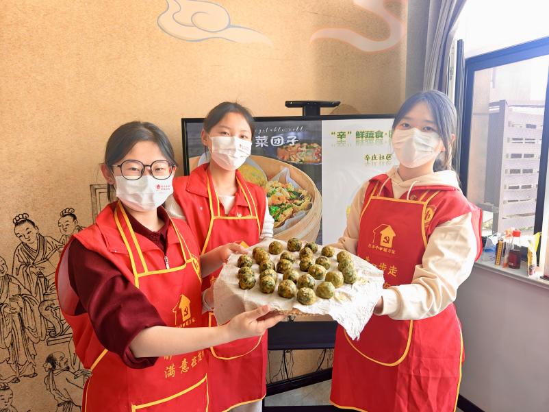 活动现场,大学生志愿者与社区妈妈们分工协作,揉面、拌馅、捏团、蒸制,一道道工序有条不紊。菜团子以玉米面、全麦粉搭配时令蔬菜为主料,少油少盐、高纤低脂,既保留了鲁南地区传统家常美食的风味,又符合当前“减油、减盐、减糖”的膳食推荐。