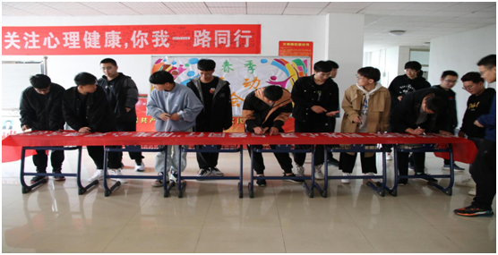 首先,我院于2021年4月16日在理工楼五楼开展了“阳光心灵,与爱同行”大型签名活动,城建学院大一年级同学全员参与。活动现场,我院心理部部长王晨及其干事,积极向同学们讲解相关心理健康知识,心理危机的识别与上报和朋辈心理辅导的相关技巧,并结合我院实际对相关心理工作做出总结,使同学们更加关注心理健康,以积极的心态去面对生活中的挫折,以乐观的态度对待生活的点点滴滴,从而营造良好的学习生活氛围。