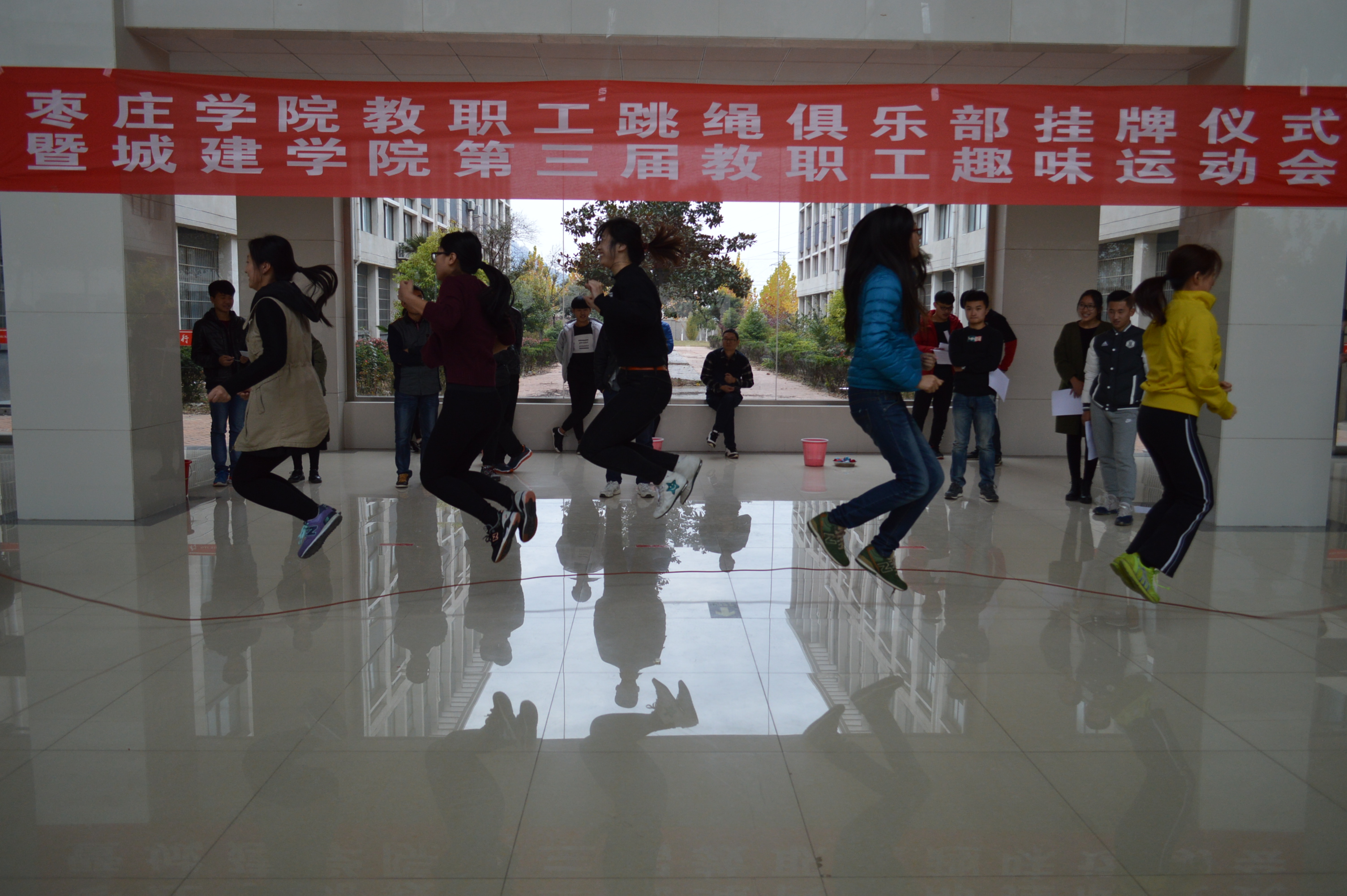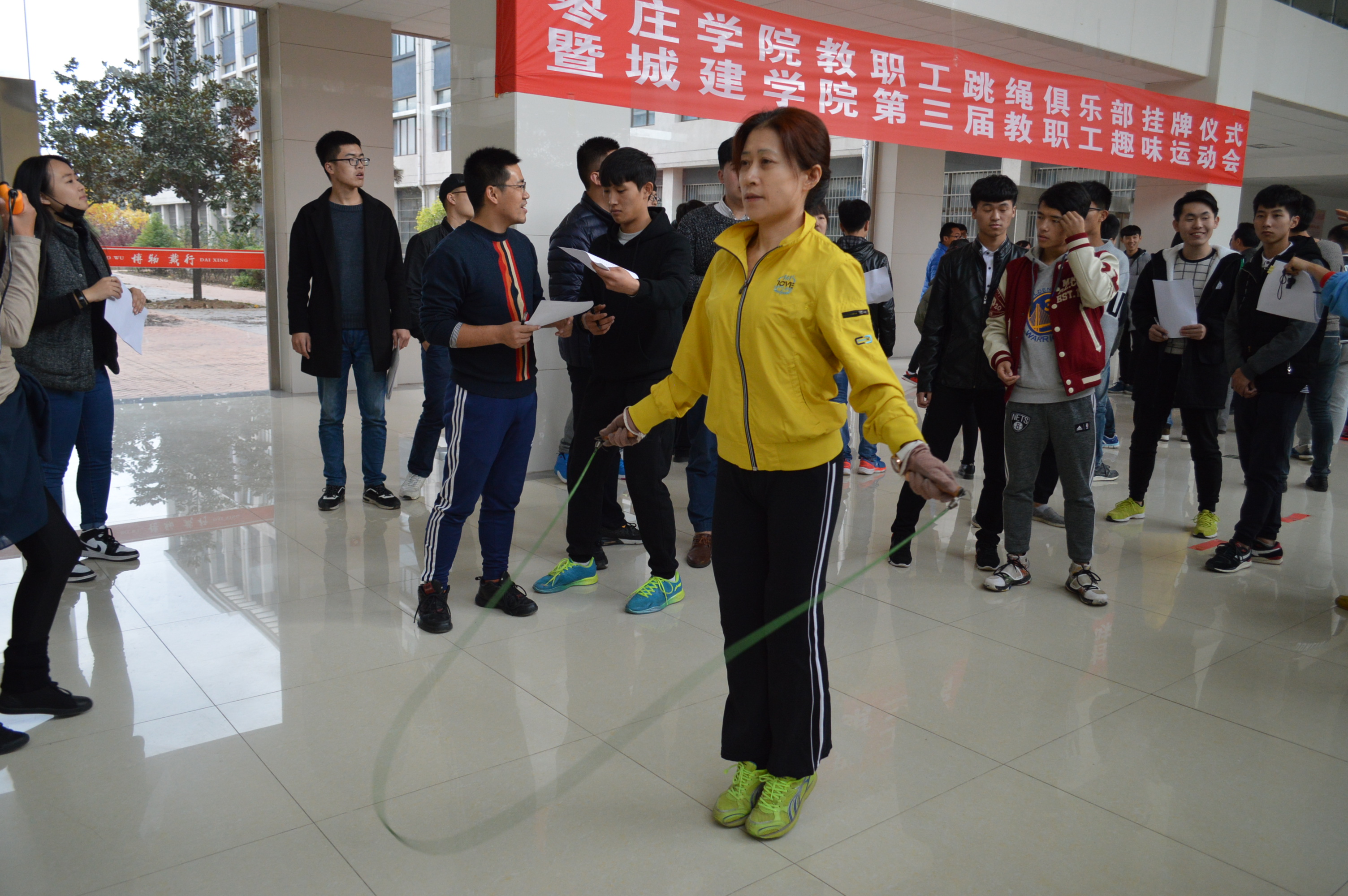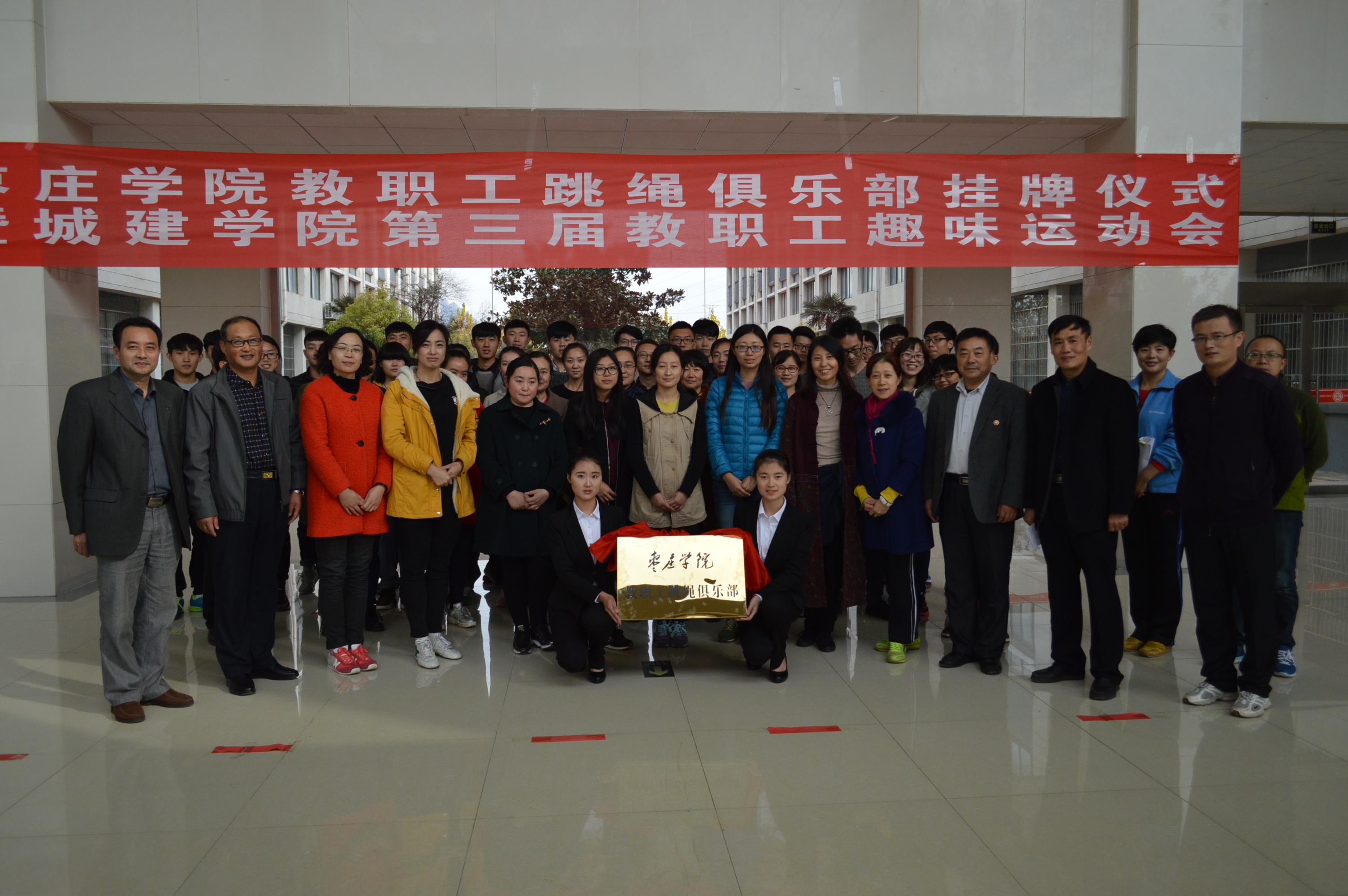 为了丰富教职工的文化生活,增强教职工的体质,11月16日下午,城建学院在新实验楼大厅举办了bv1946伟德教职工跳绳俱乐部揭牌仪式暨城建学院第三届教职工趣味运会。校工会主席韩帮泉、部分单位部门分工会及城建学院全体教职工参加了此次活动。