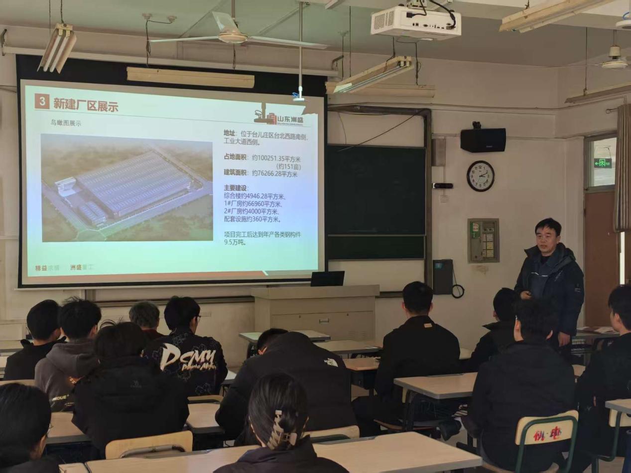 宣讲会开始,陈功超经理向同学们讲述了公司的整体概况、发展历程、企业文化、组织架构以及主营业务等内容,让同学们对洲盛重工有了初步的认识和了解。随后,陈经理详细介绍了公司的人才岗位需求,福利待遇、人才培养和新员工入职后的职业发展规划等。